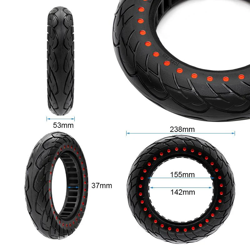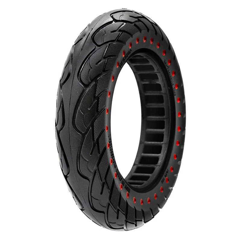Puhkeamaton honeycomb-rengas 10-tuumaisiin sähköpotkulautoihin. Rei’itetty kennosto vaimentaa iskua paremmin kuin umpinainen täyskumirengas ja tekee ajosta hiljaisempaa.